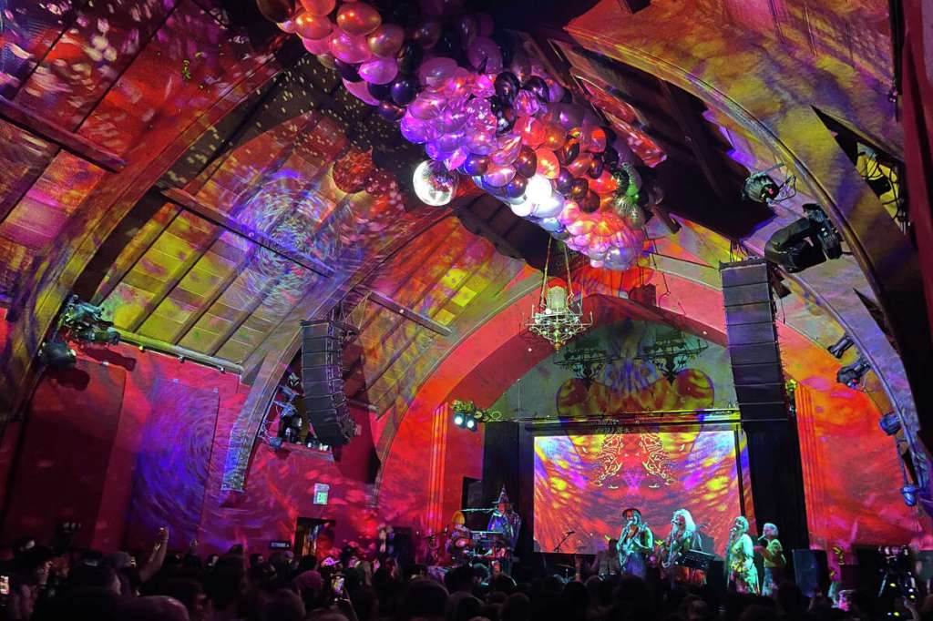 In addition to the 1970s-inspired liquid light show provided by Mad Alchemy, who performs with psych bands nationwide, Friday’s set included a festive backdrop on the Chapel’s mezzanine, where fans took group photos and selfies alongside gigantic props like a lifesize spiked choker necklace.